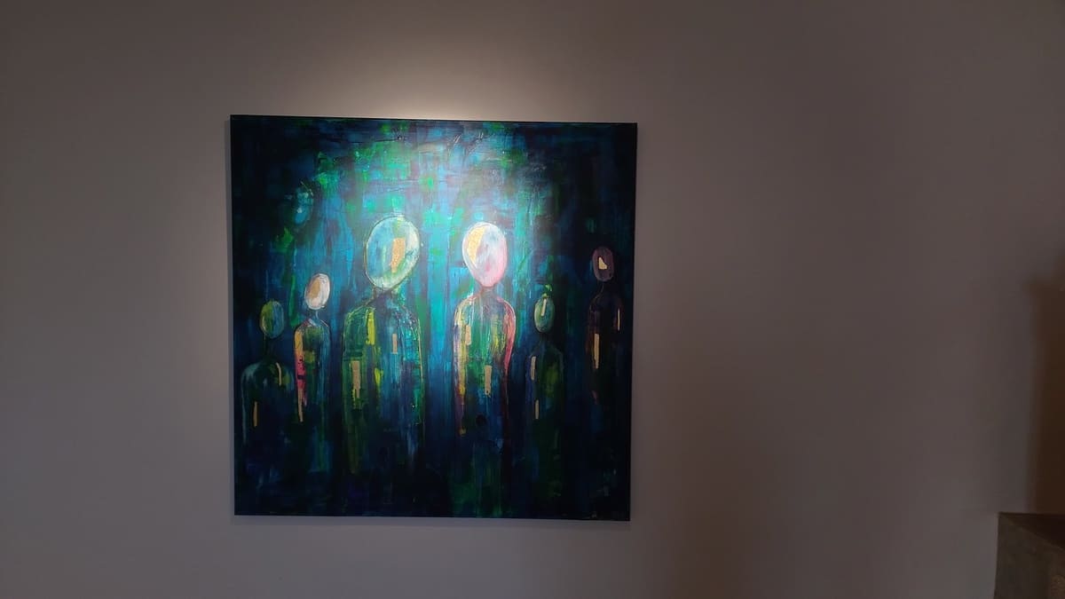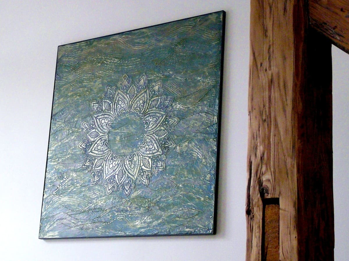 Když maluju na zakázku, neposlouchám jen tvé zadání. Naslouchám místu – protože obraz nechce jen krášlit stěnu, chce dýchat s prostorem, mluvit beze slov barvami, které milujete. Někdy v jógovém studiu, jindy v novém bytě, který ještě nemá vzpomínky – a obraz je to první, co tu začne promlouvat.